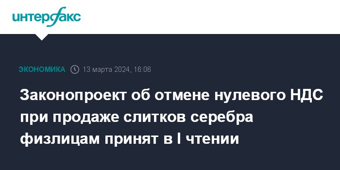 Москва. 13 марта. INTERFAX.RU - Госдума приняла в первом чтении законопроект сенаторов, который отменяет нулевой НДС на продажу банками, аффинажными организациями и "Гознаком" серебра в слитках физическим лицам. Также поддержана отмена введенной с 1 октября 2023 г. льготы по НДС в случае, если продажу серебра в слитках гражданам проводит компания, его добывающая.