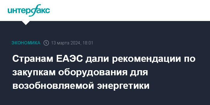 Москва. 13 марта. INTERFAX.RU - Евразийская экономическая комиссия (ЕЭК) рекомендует странам Евразийского экономического союза (ЕАЭС) закупать оборудование для нужд возобновляемой энергетики у производителей из сформированного комиссией перечня, сообщила пресс-служба ЕЭК.