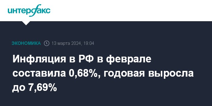 Годовая инфляция, по данным Росстата, в феврале ускорилась до 7,69% (аналитики ожидали 7,65%) с 7,44% на конец января и 7,42% на конец декабря 2023 года.