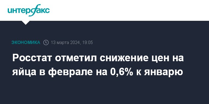 Москва. 13 марта. INTERFAX.RU - В России в феврале потребительские цены на яйца по сравнению с январем снизились на 0,6%, мясо кур стало дешевле на 1,2%, сообщил Росстат.
