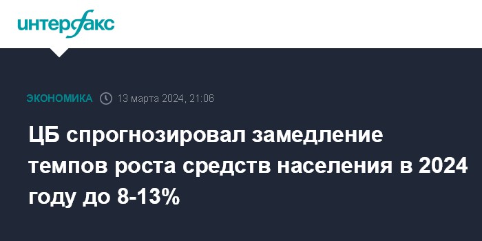 Москва. 13 марта. INTERFAX.RU - ЦБ РФ прогнозирует сдержанный прирост средств населения на счетах в банках в 2024 году: 8-13% против 20% в 2023 году, говорится в аналитическом обзоре регулятора.