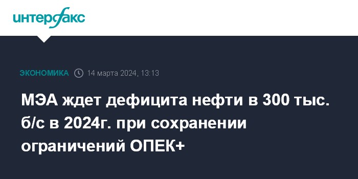МЭА ждет дефицита нефти в 300 тыс. б/с в 2024г. при сохранении ограничений ОПЕК+