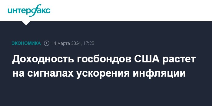Москва. 14 марта. INTERFAX.RU - Доходность государственных облигаций США умеренно повышается в четверг, инвесторы оценивают данные о ценах производителей в Штатах, которые выросли в феврале сильнее прогнозов.