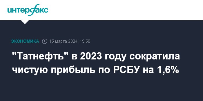 Москва. 15 марта. INTERFAX.RU - Чистая прибыль "Татнефти" по РСБУ в 2023 году сократилась на 1,6% - до 238,11 млрд рублей, говорится в отчете компании.