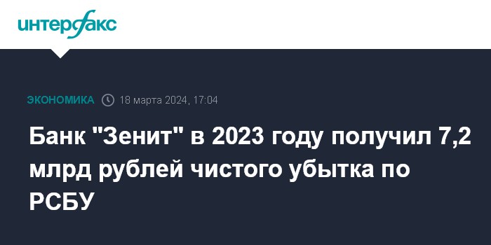 Москва. 18 марта. INTERFAX.RU - Банк "Зенит" в 2023 году получил чистый убыток по РСБУ в размере 7,2 млрд рублей против 811,2 млн рублей чистой прибыли годом ранее, говорится в отчетности кредитной организации.