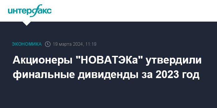Москва. 19 марта. INTERFAX.RU - Акционеры "НОВАТЭКа" на заочном годовом собрании утвердили дивиденды за 2023 год в размере 78,59 рубля на акцию (с учетом уже выплаченных за первое полугодие 34,5 рубля на акцию), сообщила компания.