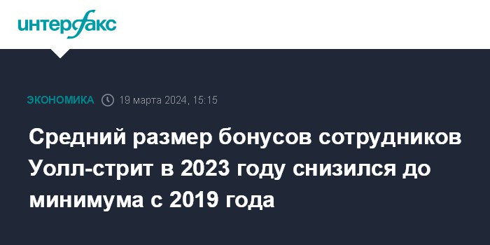 Средний размер бонусов сотрудников Уолл-стрит в 2023 году снизился до минимума с 2019 года