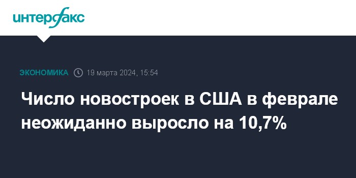 Москва. 19 марта. INTERFAX.RU - Число домов, строительство которых было начато в США в феврале, увеличилось на 10,7% относительно предыдущего месяца и составило 1,521 млн в пересчете на годовые темпы, говорится в пресс-релизе министерства торговли страны.