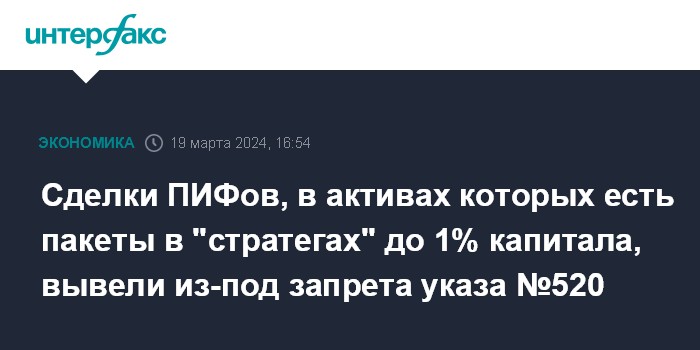 Москва. 19 марта. INTERFAX.RU - Президент РФ Владимир Путин вывел сделки паевых инвестиционных фондов (ПИФов), в активах которых есть пакеты в стратегических компаниях в пределах 1% капитала, из-под ограничений указа N520 "О применении специальных экономических мер в финансовой и топливно-энергетической сферах в связи с недружественными действиями некоторых иностранных государств и международных организаций".