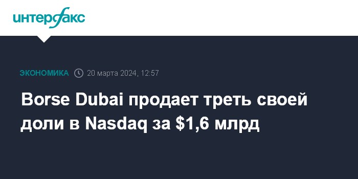 Москва. 20 марта. INTERFAX.RU - Дубайская биржа (Borse Dubai) продает примерно треть принадлежащих ей акций американского биржевого оператора Nasdaq Inc.