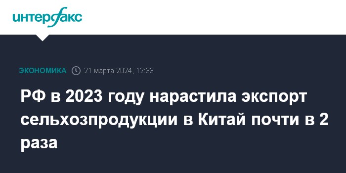 РФ в 2023 году нарастила экспорт сельхозпродукции в Китай почти в 2 раза