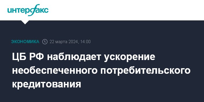Москва. 22 марта. INTERFAX.RU - ЦБ РФ отмечает ускорение необеспеченного потребительского кредитования, говорится в пресс-релизе Банка России по итогам заседания совета директоров.