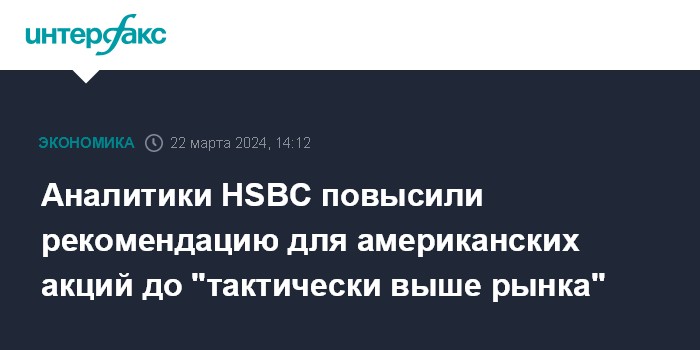 Москва. 22 марта. INTERFAX.RU - Аналитики британского банка HSBC улучшили рекомендацию для акций американских компаний до "тактически выше рынка" с нейтрального уровня на ожиданиях смягчения денежно-кредитной политики Федеральной резервной системы США.