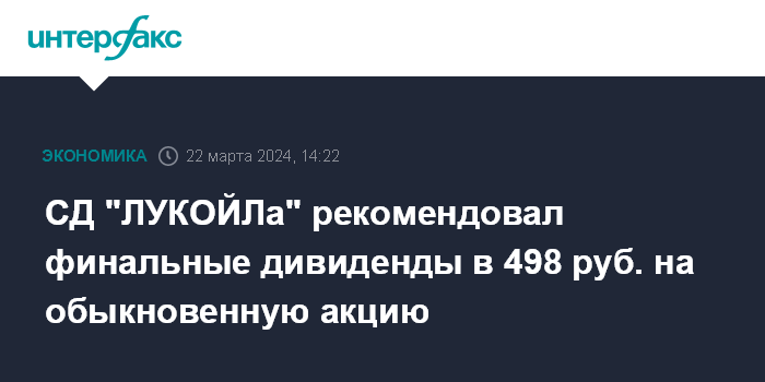 Москва. 22 марта. INTERFAX.RU - Совет директоров "ЛУКОЙЛа" рекомендовал выплатить дивиденды по обыкновенным акциям по результатам 2023 года в размере 498 рублей на одну обыкновенную акцию (не включающие промежуточные дивиденды, выплаченные по результатам девяти месяцев 2023 года в размере 447 рублей на одну обыкновенную акцию), сообщила компания.
