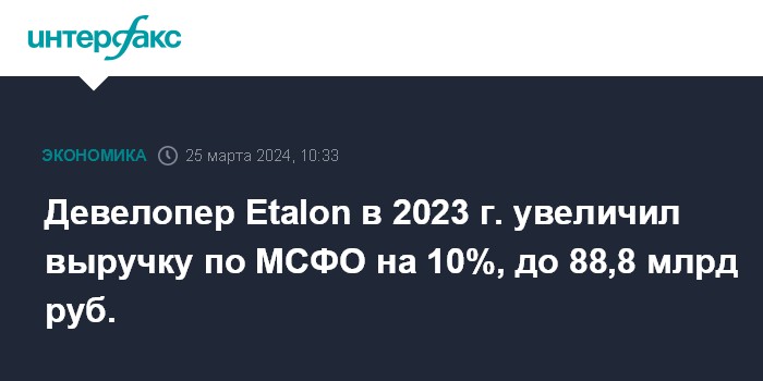 Москва. 25 марта. INTERFAX.RU - Девелопер Etalon Group в 2023 году увеличил выручку по МСФО на 10% по сравнению с показателем 2022 года - до 88,8 млрд рублей, говорится в материалах компании.