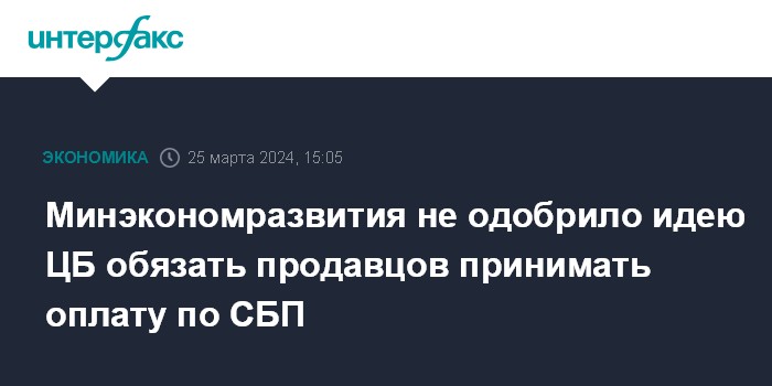 Москва. 25 марта. INTERFAX.RU - Минэкономразвития не поддержало законопроект, который обязывает крупных продавцов (с выручкой более 30 млн рублей за предшествующий календарный год) принимать оплату через Систему быстрых платежей (СБП) уже с октября 2024 года. Об этом сообщил источник "Интерфакса", знакомый с ситуацией. По мнению министерства, предложение ЦБ приведет к дополнительным расходам и административному давлению на бизнес.