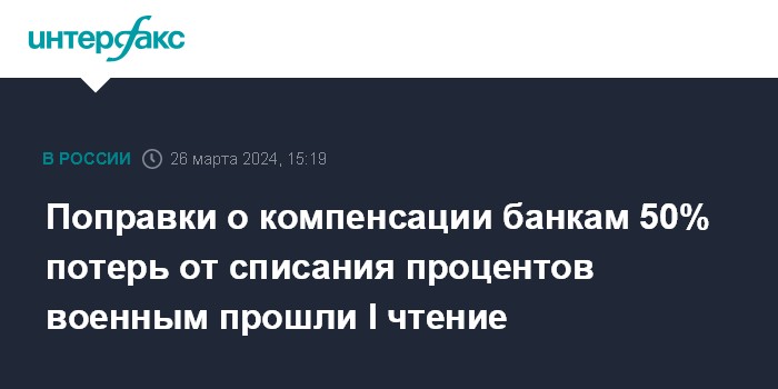 Москва. 26 марта. INTERFAX.RU - Госдума приняла в первом чтении законопроект, который предполагает, что государство будет компенсировать банкам и некредитным финансовым организациям 50% потерь от списания процентов по кредитам военнослужащих в рамках действия для них кредитных каникул.