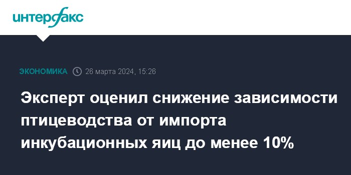 Москва. 26 марта. INTERFAX.RU - РФ продолжает импортировать инкубационные яйца, но зависимость от зарубежных поставок существенно снизилась.