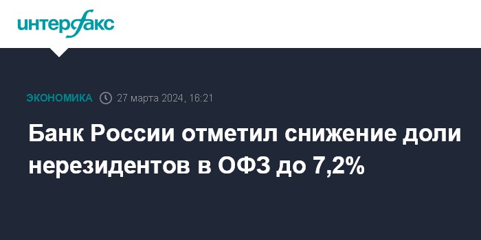 Москва. 27 марта. INTERFAX.RU - Доля нерезидентов в ОФЗ в феврале 2024 года снизилась до 7,2% с 7,3% , сообщает сайт Банка России. Значение этого показателя на 1 марта стало минимальным с 1 июля 2012 года, тогда доля нерезидентов составляла 6,5%.