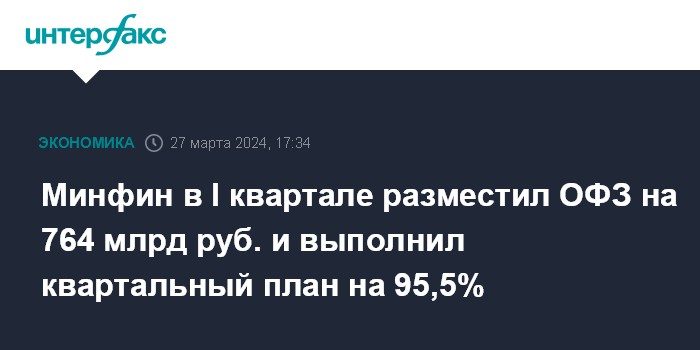 Москва. 27 марта. INTERFAX.RU - Министерство финансов России в первом квартале 2024 года в ходе первичных аукционов разместило облигации федерального займа (ОФЗ) на общую сумму почти 764 млрд рублей по номиналу, выполнив квартальный план размещения на 95,5%.