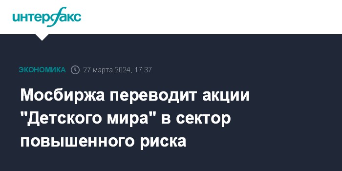 Москва. 27 марта. INTERFAX.RU - "Московская биржа" приняла решение с 28 марта включить в cектор компаний повышенного инвестиционного риска обыкновенные акции ПАО "Детский мир".