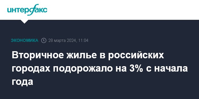 Москва. 28 марта. INTERFAX.RU - Жилье на вторичном рынке в 70 городах с населением свыше 300 тысяч человек подорожало на 3% за I квартал 2024 года, подсчитали в "Мире квартир".