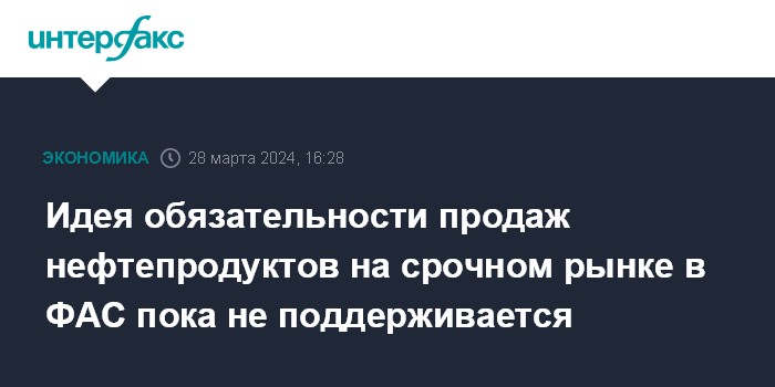 Москва. 28 марта. INTERFAX.RU - Идея обязательности продаж нефтепродуктов на биржевом срочном рынке пока не поддерживается, сообщил журналистам замглавы ФАС Виталий Королев в кулуарах форума "Биржевой товарный рынок-2024", организованного СПбМТСБ.