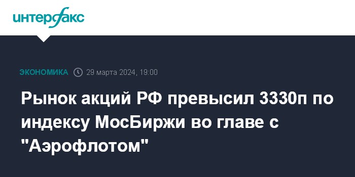 Рынок акций РФ превысил 3330п по индексу МосБиржи во главе с "Аэрофлотом"