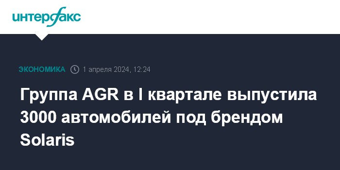 Москва. 1 апреля. INTERFAX.RU - AGR Automotive Group (ООО "АГР") в первом квартале 2024 года выпустила 3 тысячи автомобилей под брендом Solaris, сообщает пресс-служба компании.