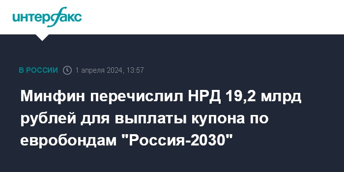 Минфин перечислил НРД 19,2 млрд рублей для выплаты купона по евробондам "Россия-2030"