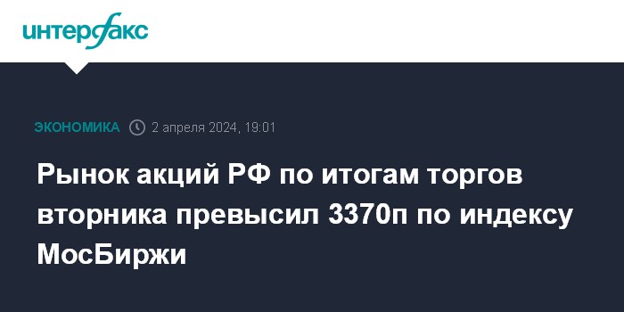 Рынок акций РФ по итогам торгов вторника превысил 3370п по индексу МосБиржи