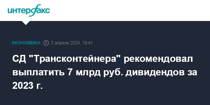 Москва. 2 апреля. INTERFAX.RU - Совет директоров ПАО "Трансконтейнер" (входит в ГК "Дело") рекомендовал единственному акционеру направить 7 млрд руб. на выплату дивидендов за 2023 г., сообщила компания.