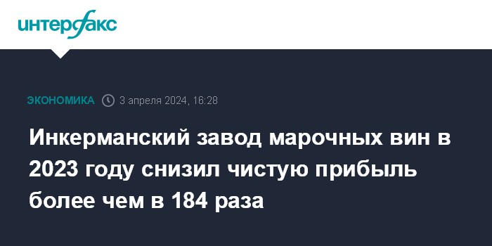 Москва. 3 апреля. INTERFAX.RU - ООО "Инкерманский завод марочных вин" (ИЗМВ, Севастополь) в 2023 году получило чистую прибыль по РСБУ в размере 5,28 млн рублей против 974,3 млн рублей в 2022 году, говорится в отчетности компании.