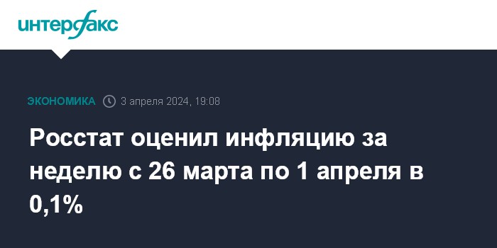 Москва. 3 апреля. INTERFAX.RU - Инфляция в России с 26 марта по 1 апреля 2024 года составила 0,1% после 0,11% с 19 по 25 марта, 0,06% с 12 по 18 марта, нулевой динамики (0,00%) с 5 по 11 марта и 0,09% с 27 февраля по 4 марта, сообщил Росстат.