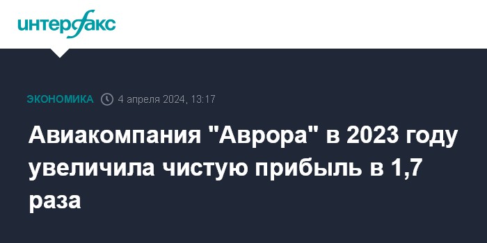 Москва. 4 апреля. INTERFAX.RU - АО "Авиакомпания "Аврора" (Южно-Сахалинск, крупнейший авиаперевозчик на Дальнем Востоке) в 2023 году увеличило чистую прибыль по РСБУ в 1,7 раза относительно 2022 года – до 3,449 млрд рублей, сообщается в отчетности компании.