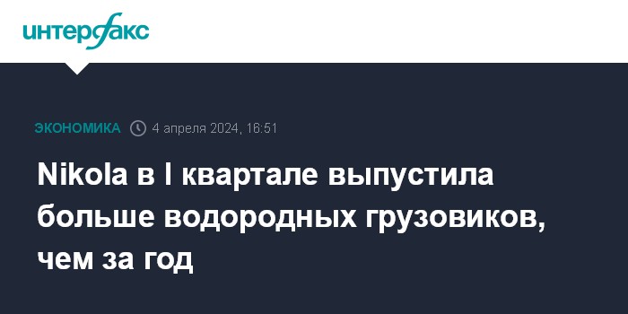 Москва. 4 апреля. INTERFAX.RU - Американская Nikola Corp. в первом квартале 2024 года выпустила 43 грузовика на водородном топливе по сравнению с 42 машинами за весь 2023 год. Об этом сообщила сама компания.
