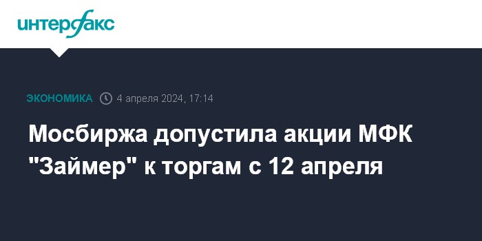 Мосбиржа допустила акции МФК "Займер" к торгам с 12 апреля