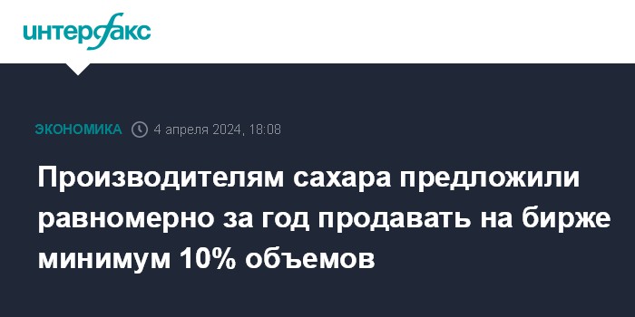 Москва. 4 апреля. INTERFAX.RU - Минсельхоз РФ и Федеральная антимонопольная служба РФ (ФАС) для борьбы с сезонными колебаниями предложения на рынке сахара рекомендовали участникам рынка включить в торгово-сбытовые политики обязательство по продаже на бирже не менее 10% объемов с равномерным распределением по месяцам года.