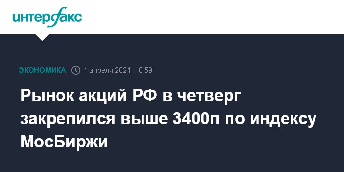 Москва. 4 апреля. INTERFAX.RU - Рынок акций РФ в четверг продемонстрировал смешанную динамику цен blue chips из-за выборочной фиксации прибыли игроками на фоне приостановки роста нефти (Brent закрепляется выше $89 за баррель) и улучшения внешней фондовой конъюнктуры. Индекс МосБиржи превысил 3400 пунктов (максимум с февраля 2022 года) во главе с обновившими максимум с ноября 2023 года бумагами "Русала" (+6,9%); в аутсайдерах выступили перегретые ранее бумаги "Аэрофлота" (-3,3%) и Polymetal (-2,2%).