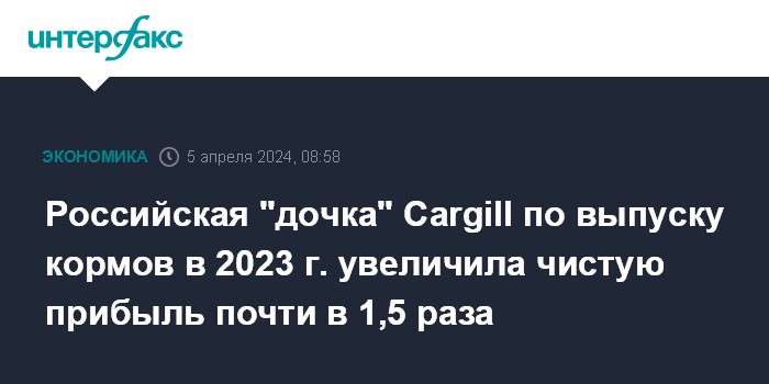 Российская "дочка" Cargill по выпуску кормов в 2023 г. увеличила чистую прибыль почти в 1,5 раза