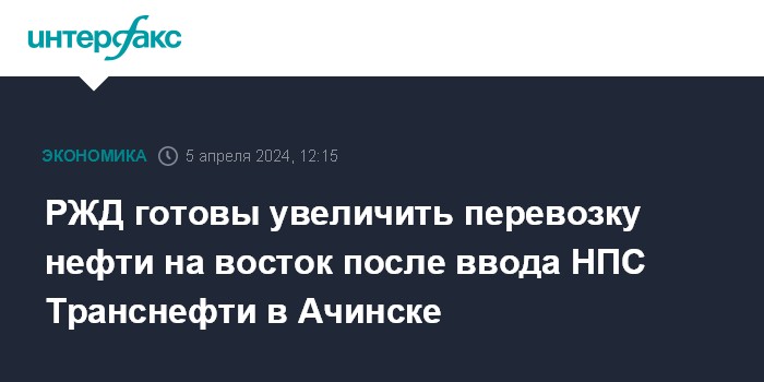 Москва. 5 апреля. INTERFAX.RU - ОАО "РЖД" готово увеличить транспортировку нефти в восточном направлении после ввода ПАО "Транснефть" нефтеперекачивающей станции (НПС) в Ачинске, также готовы к увеличению транспортировки нефтепродуктов, заявил журналистам заместитель гендиректора РЖД Алексей Шило.