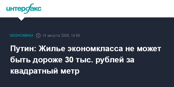 Сочи. 14 августа. INTERFAX.RU - Стоимость квадратного метра жилья экономкласса не должна превышать 30 тысяч рублей, заявил премьер-министр РФ Владимир Путин.