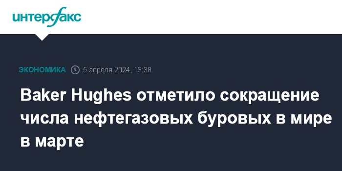 Москва. 5 апреля. INTERFAX.RU - Число действующих нефтяных и газовых буровых установок в мире в марте сократилось из-за Канады, сообщила американская нефтесервисная компания Baker Hughes.