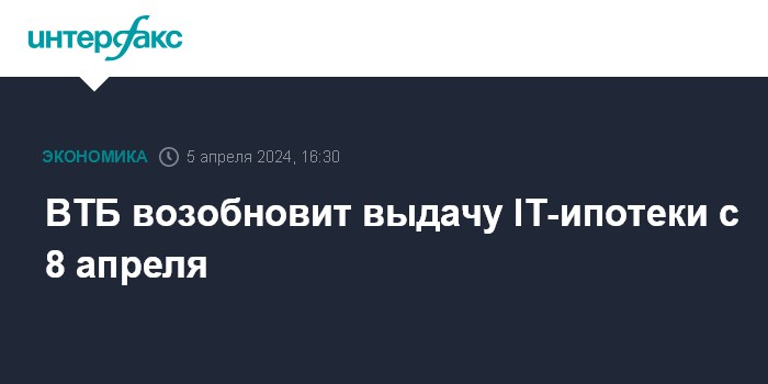 ВТБ возобновит выдачу IT-ипотеки с 8 апреля