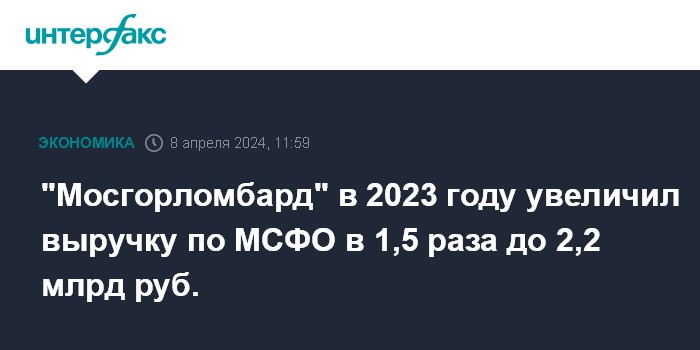 "Мосгорломбард" в 2023 году увеличил выручку по МСФО в 1,5 раза до 2,2 млрд руб.