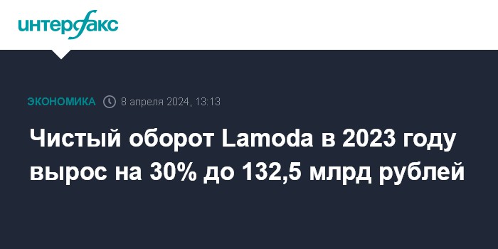 Москва. 8 апреля. INTERFAX.RU - Ритейлер в сфере моды Lamoda в 2023 году увеличил чистый оборот (NMV, стоимость всех покупок, сделанных на Lamoda в РФ, Белоруссии и Казахстане, включая НДС, сервисные сборы, плату за доставку, после учета возвратов и скидок - ИФ) на 30% до 132,5 млрд рублей, говорится в сообщении компании.
