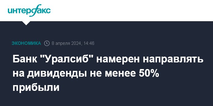 Москва. 8 апреля. INTERFAX.RU - Банк "Уралсиб" будет стремиться направлять на выплату дивидендов не менее 50% чистой прибыли за год, следует из опубликованной дивидендной политики кредитной организации. Набсовет банка утвердил документ 4 апреля 2024 года на три года.