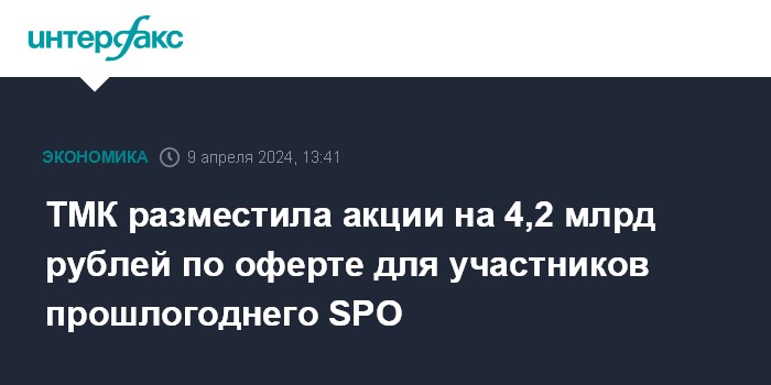 Москва. 9 апреля. INTERFAX.RU - ПАО "Трубная металлургическая компания" (ТМК) разместило акции на 4,2 млрд рублей в рамках оферты для участников SPO, которое состоялось в сентябре 2023 года.