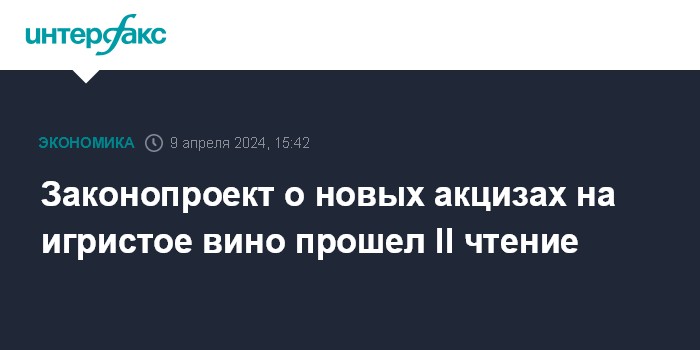Москва. 9 апреля. INTERFAX.RU - Госдума приняла во втором чтении законопроект, который снижает темпы запланированного к повышению с 1 мая 2024 года роста акцизов на игристые вина, включая российское шампанское, при этом модифицируется система взимания акцизов на крепленое вино и налоговых вычетов для российских производителей вин.