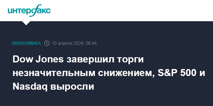 Москва. 10 апреля. INTERFAX.RU - Фондовый индекс Dow Jones Industrial Average завершил торги во вторник в небольшом минусе, S&P 500 и Nasdaq Composite выросли.
